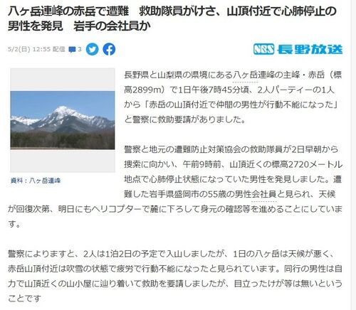 ※長野放送より出典 赤岳で遭難事故が発生について 何故、赤岳頂上山荘に避難しなかったのか!? 悪天候での登山と赤岳での遭難事故に思う事のまとめ 赤岳で遭難事故が発生について 5月1日に八ヶ岳の主峰である赤岳(標高2,899m)へ登山した2人組の…